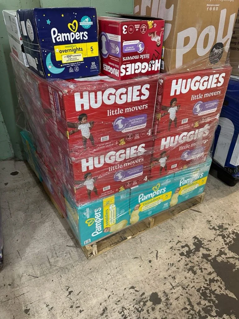 Types and Conditions: Diaper pallets can include new, unexpired diapers, customer returns, unmanifested merchandise, or general merchandise. Some pallets may have new damaged boxes or be uninspected and sold “as-is” without returns